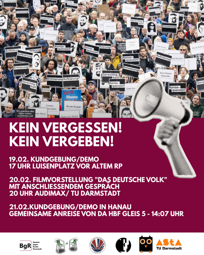 Pressemitteilung/Aufruf Am 19. Februar 2026 jährt sich das rassistische Attentat von Hanau zum sechsten Mal. Neun Menschen wurden aus rassistischem Hass ermordet. Ibrahim Akkuş, das zehnte Todesopfer, starb im Januar 2026 an den Folgen dieser Tat. Wir vergessen keinen von ihnen. Gökhan Gültekin Sedat Gürbüz Said Nesar Hashemi Mercedes Kierpacz Hamza Kurtović Vili Viorel Păun Fatih Saraçoğlu Ferhat Unvar Kaloyan Velkov Ibrahim Akkuş Rechter Terror ist kein Einzelfall. Rassismus tötet – und er wird durch Wegschauen, Verharmlosung und politische Untätigkeit begünstigt. Das Bündnis gegen Rechts Darmstadt ruft daher am 19. Februar um 17 Uhr zur Gedenk- und Protestkundgebung / Demo…