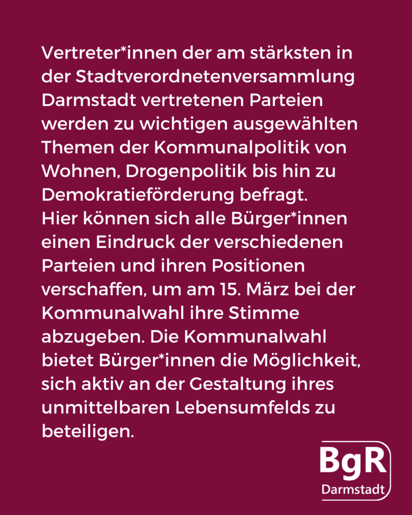 Die Vertreter*innen der am stärksten in der Stadtverordnetenversammlung Darmstadt vertretenen Parteien werden zu wichtigen ausgewählten Themen der Kommunalpolitik von Wohnen, Drogenpolitik bis hin zu Demokratieförderung befragt. Hier können sich alle Bürger*innen einen Eindruck der verschiedenen Parteien und ihren Positionen verschaffen, um am 15. März bei der Kommunalwahl ihre Stimme abzugeben. Die Kommunalwahl bietet Bürger*innen die Möglichkeit, sich aktiv an der Gestaltung ihres unmittelbaren Lebensumfelds zu beteiligen.